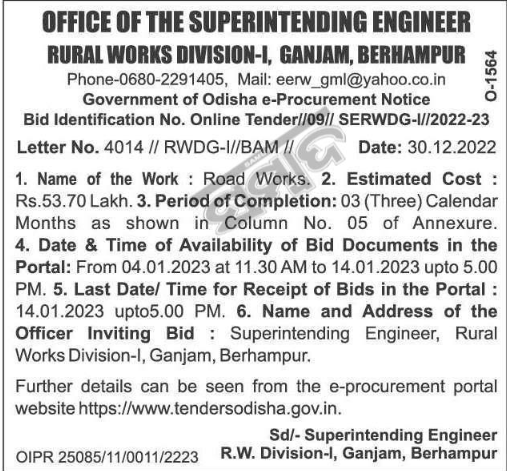 Tender for Road Works OFFICE OF THE SUPERINTENDING ENGINEER RURAL WORKS DIVISION-I, GANJAM, BERHAMPUR