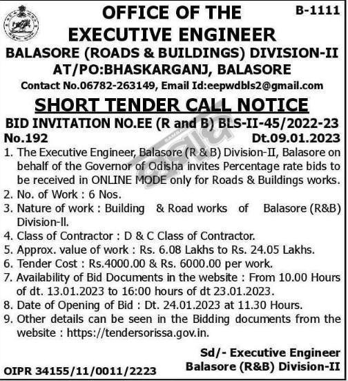 Tender for Roads & Buildings works. 2. No. of Work: 6 Nos. 3. Nature of work: Building & Road works of Balasore (R&B) Division-II.