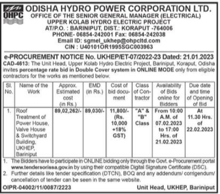 Tender for Roof Treatment of Power House, Valve House & Switchyard Building. UKHEP, Approx