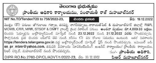 Tender for R&R in Jogulamba Gadwala, Vanaparthi, Nagar Kurnool, Narayan Pate & Mahbubnagar Districts.
