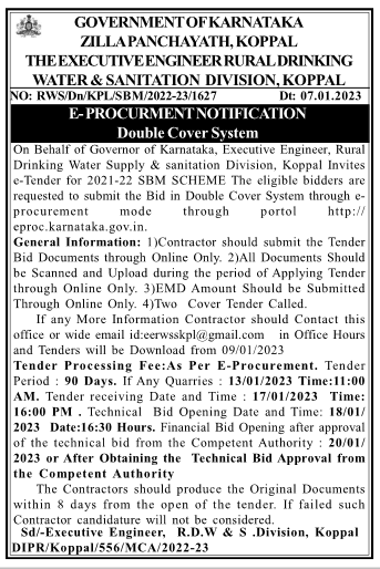 Engineer, Rural Drinking Water Supply & sanitation Division, Koppal Invites e-Tender for 2021-22 SBM SCHEME