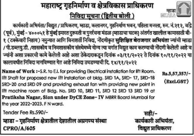 Tender for S.R. to E.l. for providing Electrical installation for lift Room. lift Shaft for proposed new lift installation at bldg. SRD 1A, SRD-17, SRD-18 SRD-20 and SRD 09 and providing exhaust fan with providing new point in lift machine room of Bldg. No. SRD 10, SRD 11, SRD 12 SRD 13 SRD 19 at Pratiksha Nagar, Sion under DyCE Zone-IV MBRR Board Mumbai for the year 2022-2023. FN ward. |Tender Fee Rs.590.