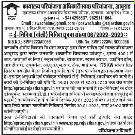 Tender for (School Block, Hostel, Staff Quarter, Dining Hall, Four Wall, Tubewell) in New Tribal Residential School, Jodhpur (Capacity 400) by Swachh Project Aburod, funded by Tribal Regional Development Department,