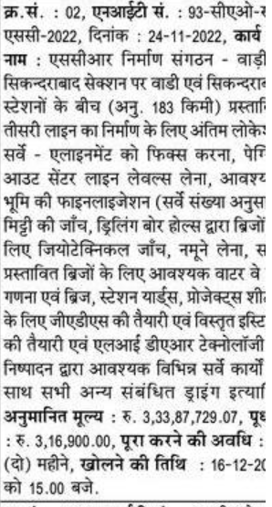 Tender for SCR Nirman Sangathan to final loker survey alignment for construction of proposed third line between Wadi and Secunderabad stations on Wadi Secunderabad section