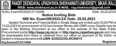 Tender for Sealed Technical and Financial Bids in Single Stage are invited upto 03.00 PM of 13.03.2023 for procurement of 24 lacs Answer Books with OMR cover. Details may be seen in the Bidding Document at our office or the website of the State Public Procurement portal http://sppp.raj.nic.in or http://eproc.rajasthan.gov.in and may be downloaded from there or obtained from our office on payment of Rs 2500/- in banker’s cheque/demand draft.UBN-SUS2223GLRC00015 Raj.Samwad/C/22/14888