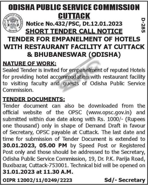 Tender for Sealed Tender is invited for empanelment of reputed Hotels for providing hotel accommodation with restaurant facility to visiting faculty and guests of Odisha Public Service Commission.