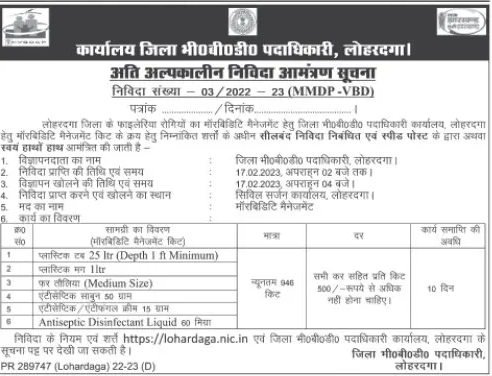 Tender for Sealed tenders are invited by registered and speed post or by hand for the purchase of Morbidity Management Kit for District B.B.D. Officer’s Office, Lohardaga for the pride management of Filaria patients ofTender for Sealed tenders are invited by registered and speed post or by hand for the purchase of Morbidity Management Kit for District B.B.D. Officer’s Office, Lohardaga for the pride management of Filaria patients of Lohardaga district,
