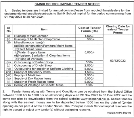 Tender For Sealed tenders are invited for annual contract/lease from reputed firms/dealers for the undermentioned supplies/contracts to Sainik School Imphal for the period commencing.