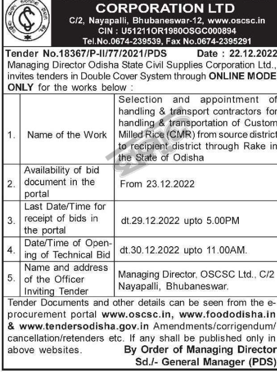 Tender for Selection and appointment of handling & transport contractors for handling & transportation of Custom Milled Rice (CMR) from source district to recipient district through Rake in the State of Odisha