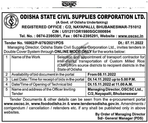 Tender for Selection and appointment of transport contractor for inter-district transportation of Custom Milled Rice (CMR) from source districts to recipient districts in the State of Odisha