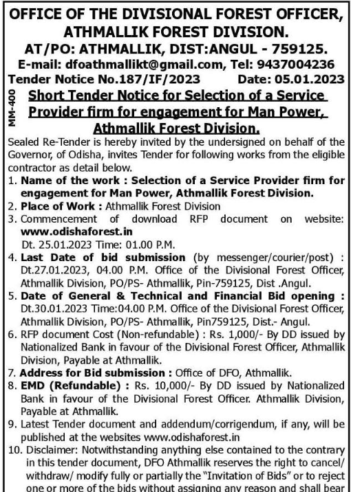 Tender for Selection of a Service Provider firm for engagement for Man Power, Athmallik Forest Division.