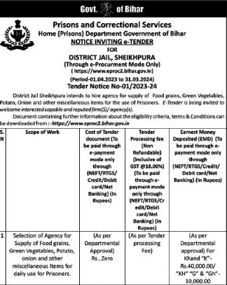 Tender for Selection of Agency for Supply of Food grains, Green Vegetables, Potato, onion and other miscellaneous Items for daily use for Prisoners.