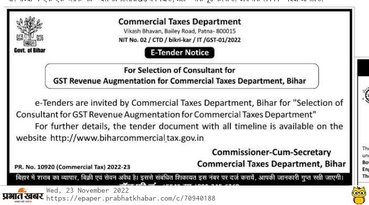 e-Tenders are invited by Commercial Taxes Department, Bihar for “Selection of