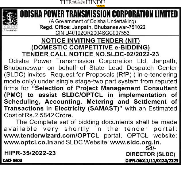 Tender for “Selection of Project Management Consultant (PMC) to assist SLDC/OPTCL
