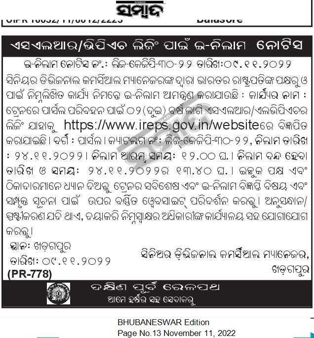 Tender for Senior Divisional Commercial Manager on behalf of the President of India and for 02 (two) years SLR|LVPACH