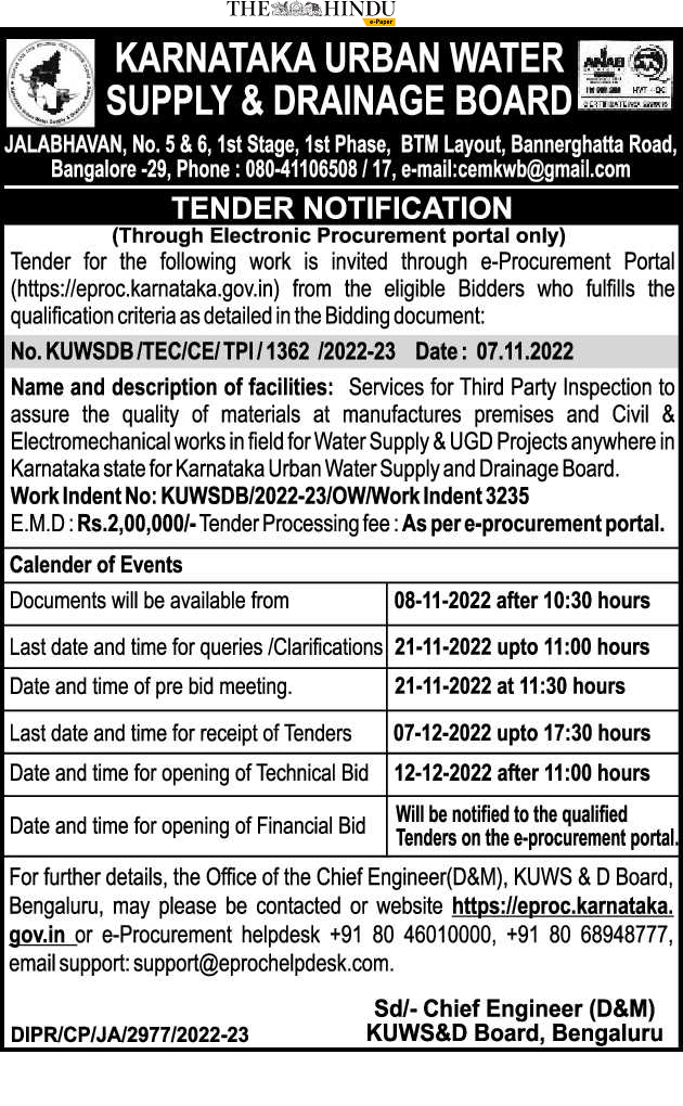 Services for Third Party Inspection to assure the quality of materials at manufactures premises and Civil & Electromechanical works in field for Water Supply & UGD Projects anywhere in Karnataka state for Karnataka Urban Water Supply and Drainage Board.