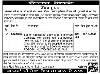 Tender for Set of Fabricatod Body Side Stanchian Complete with drilled hole (12 nos/set, item no. 1,3, 4 & 5 of drg) and Tarpaulin Cleat (35 nos/set to be supplied in loose, item no. 2 of drg) for BOXNHL wagon to RDSO Drg No. WD-09034-S-17, Alt-4.