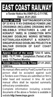 SHIFTING/MODIFICATION OF 33 KV & 11 KV OVERHEAD POWER LINE CROSSINGS (INCLUDING CROSSING WITH NBLS/BBLS STRUCTURES & LINE AT KORAPUT YARD) IN CONNECTION WITH RAILWAY DOUBLING WORKS BETWEEN KOTTAVALASA-KORAPUT & KORAPUT- SINGAPUR ROAD DOUBLING PROJECTS IN WALTAIR DIVISION OF EAST COAST RAILWAY.