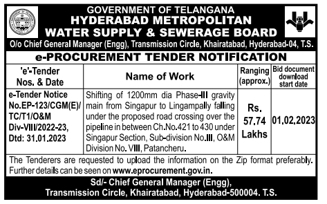Tender for Shifting of 1200mm dia Phase-II gravity main from Singapur to Lingampally falling under the proposed road crossing over the pipeline in between Ch.No.421 to 430 under Singapur Section, Sub-division No.III, O&M Division No. VIII, Patancheru.