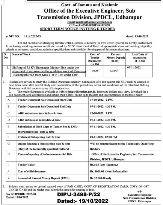 TEnder for Shifting of 33 KV Ramnagar-Majouri line under the alignment of improvement/upgradation work of Ramnaga -Basantgarh road from Kms 21st to 31st under CRF