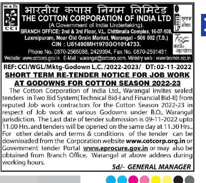 Tender For SHORT TERM RE-TENDER NOTICE FOR JOB WORK AT GODOWNS FOR COTTON SEASON 2022-23 The Cotton Corporation of India Ltd.