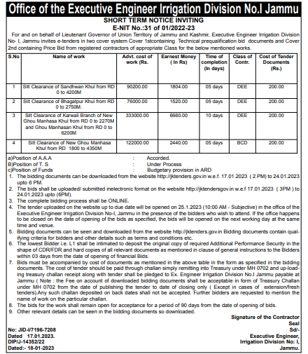 Tender for Silt Clearance of Karwall Branch of New Ghou Manhasa Khul from RD 0 to 2270M and Ghou Manhasan Khul from RD