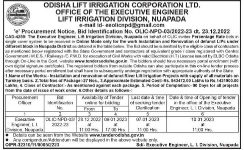 different block in Nuapada District as detailed in the table below. The Bid should be submitted by the eligible class of contractors