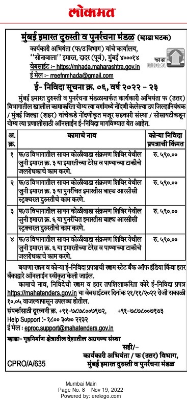 Tender For Sion Koliwada Transit Camp in F/D Division Rs. 590.00 Old building no. 3 Exterior RCC of this reconstructed building Carrying out structural repairs. Old Building at Sion Koliwada Transit Camp in 3rd F/U Division No. 6 External RCC structural repair work to this reconstructed building.