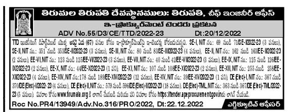 sixty seven (67) works of TTD Engineering Department. SE-I, NIT No.: 6 to 71SE-12022-23 (3 Works),  SE-II,NIT No.: 351 to 353 E-12022-23 (3 Works), SE-II, NIT No: 80 to 83/5E-112022-23 (4 Works), EE-II, NIT No.: 162 to 163 EE-112022-23 (2 Papers) EE-VI, NIT No: 123 to 125 VI2022-23 (3 Papers), EE-VI, NIT No.: 40 to 42. EE VI12022-23 (3 Papers) , EE-DX, NIT NO. 125 to 126 EE-0X2022-23 (2 works), EE-X, NIT No.: 44/EE-X/2022-23 (1 work) EE-XL NIT No: 107 to 108EE-X12022-23 (2 works ), EE-XI, NIT No.: 255 to 258 EE- X2022-23 (4 Works), EE-XIN, NIT No.: 178 to 1891EE-XNI20:22-23 (12 Works), EE-XV, NIT No. .: 39 EE-XV/2022-23 (1 Work) DE Elec-1, NIT No: 367 to 370 DE(Elec)-112022, 23(4 Works) DEEP-NIT NO. 579 to 596 DE (Elee)-12022-23 (18 works) DE(Elet)-TML, NIT No.: 363 to 367 DE E .C -TML 7202- 23 5 works)