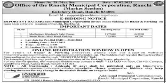 IMPORTANT DATESRanchi Municipal Corporation invites online bidding for Bazar & Parking on lease basis at Helow location of Ranchi, Jharkhand