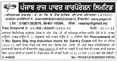 Tender for Spare Slip ring induction motor for Gantry Crane in the year 2022- 23.