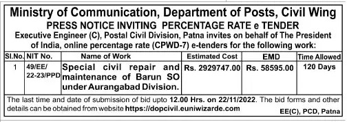 Tender for Special civil repair and maintenance of Barun So under Aurangabad Division.