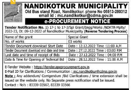 Tender for Special Grant of 03 Works in NANDIKOTKUR MUNICIPALITY