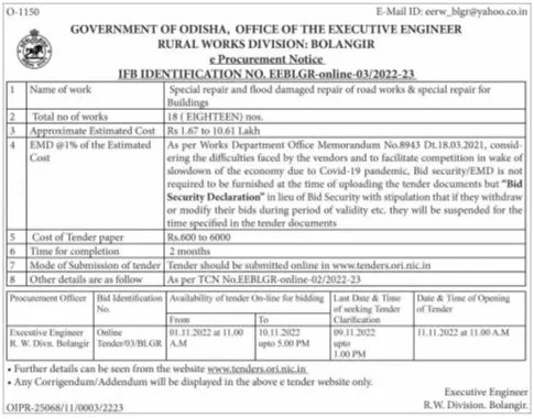 Tender for Special repair and flood damaged repair of road works & special repair for Buildings