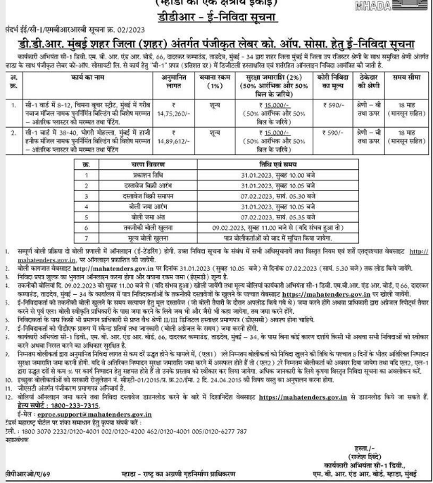 Tender for Special repair of renovated building namely Garib Nawaz Manzil at 8-12, Chimna Butcher Street, Mumbai in C-1 Ward – Repair and painting of internal plaster