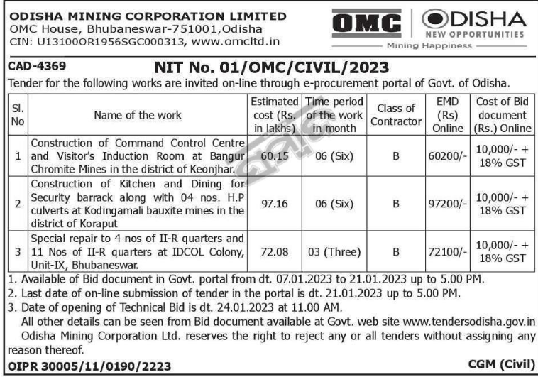 Tender for Special repair to 4 nos of II-R quarters and 11 Nos of II-R quarters at IDCOL Colony, Unit-IX, Bhubaneswar.
