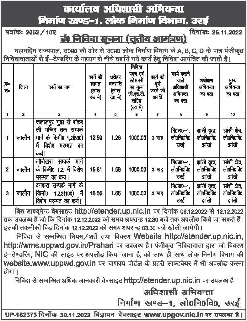 Tender for Special repair work in km 1.2 (600) of the link road from Jalalpur Gudha to Shankarji Mandir.