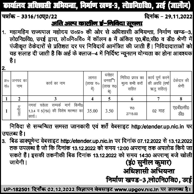 Tender for Special repair work of Nagwan Chatela link road km 1, 3, 4 and 5 (750).