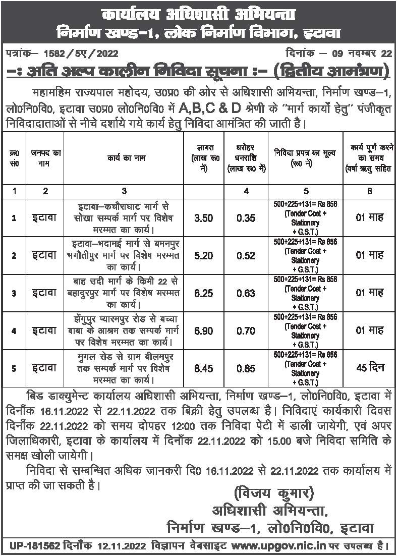 Tender for Special repair work on Sokha link road from Etawah-Kachoraghat road.