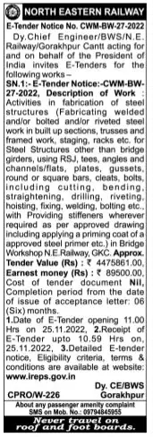 Tender for Steel Structures other than bridge girders, using RSJ, tees, angles and channels/flats, plates, gussets, round or square bars, cleats, bolts, including cutting, bending.