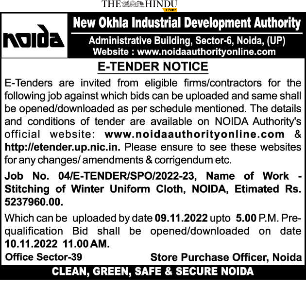 Job No. 04/E-TENDER/SPO/2022-23, Name of Work Stitching of Winter Uniform Cloth, NOIDA, Etimated Rs. 5237960.00.