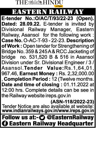 tender for Strengthening of Bridge No. 359 & 245A & RCC Jacketing of bridge no. 531,520 B & 516 in Asansol Division