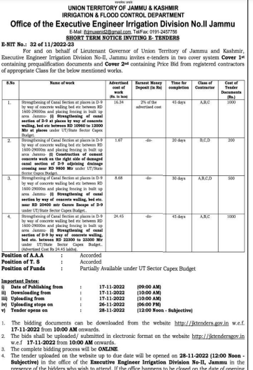 Tender for Strengthening of Canal Section at places in D-9 by way of concrete walling bed etc between RD 1600-29000m and placing fencing in built up area Jane Strengthening of cal section of D-9 at places by way of concrete walling, bed ete between RD 10960 to 12000 Mir a places under UT/State Sector Capex
