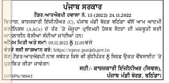 Tender for strengthening of existing Primary Health Centers as Clinics (AACs). Online bids are invited.