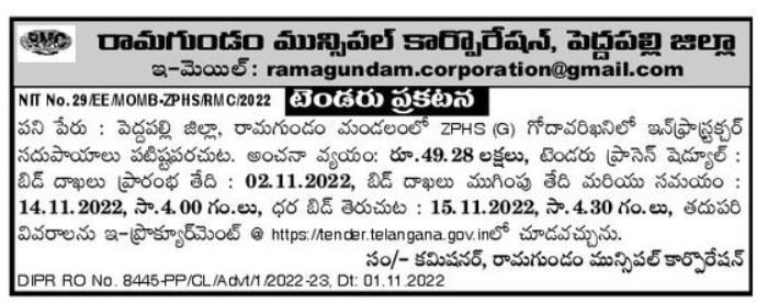 Tender for Strengthening of infrastructure facilities at ZPHS (G) Godavarikhani in Ramagundam Mandal, Peddapally District.
