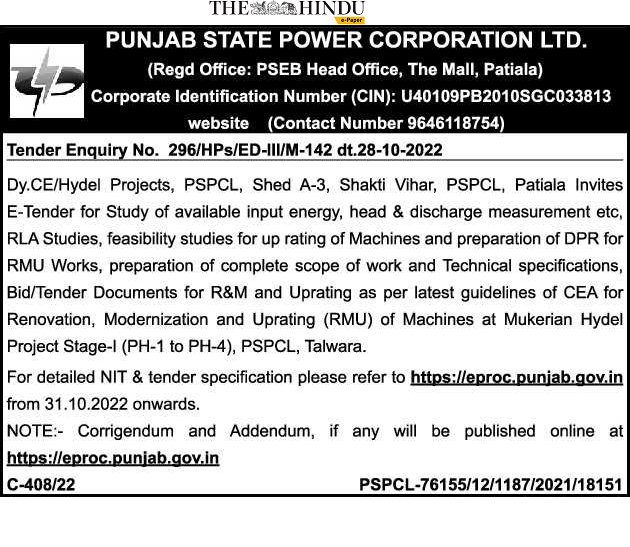 E-Tender for Study of available input energy, head & discharge measurement etc, RLA Studies, feasibility studies for up rating of Machines and preparation of DPR formb Dy.CE/Hydel Projects, PSPCL, Shed A-3, Shakti Vihar, PSPCL, Patiala Invites RMU Works, preparation of complete scope of work and Technical specifications, Bid/Tender Documents for R&M and Uprating as per latest guidelines of CEA for Renovation, Modernization and Uprating (RMU) of Machines at Mukerian Hydel