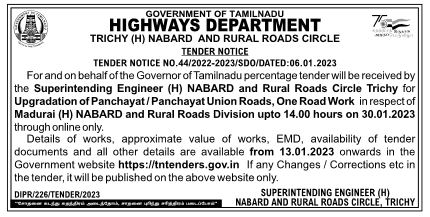 Tender for Superintending Engineer (H) NABARD and Rural Roads Circle Trichy for Upgradation of Panchayat/Panchayat Union Roads, One Road Work