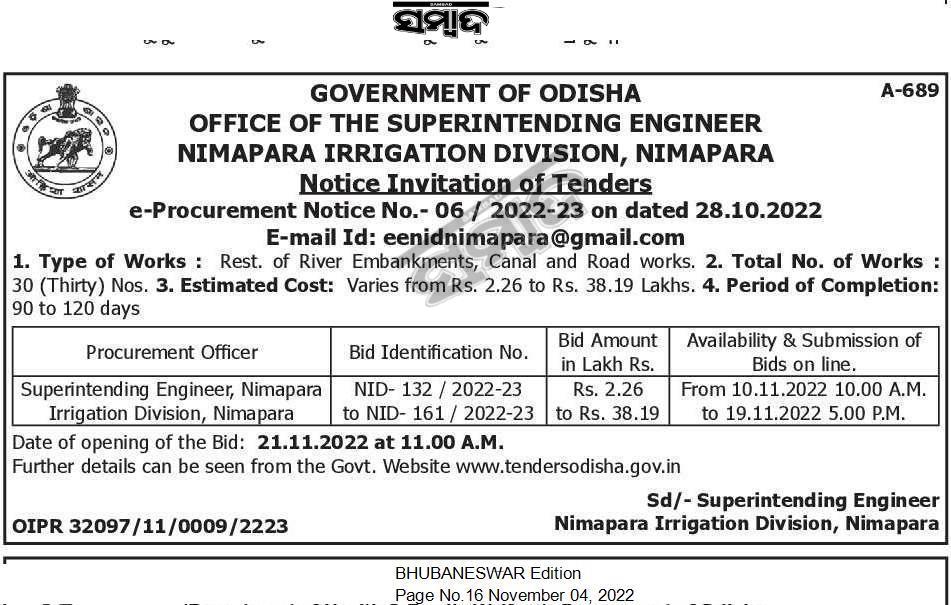 Tender for Superintending Engineer, Nimapara Irrigation Division, Nimapara