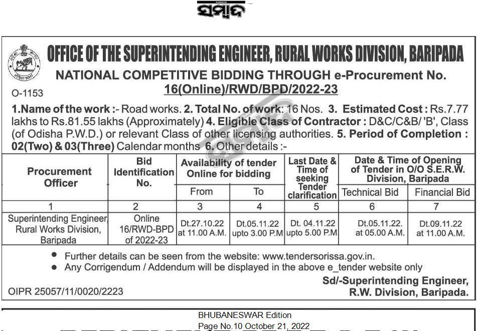 Tender for Superintending Engineer Rural Works Division, Baripada