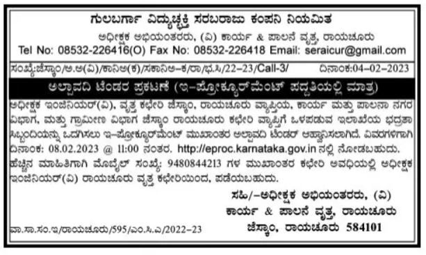Tender for Superintending Engineer(V), Circle Office JESCOM, Raichur Range, Work and Custody Urban Division, and Rural Division JESCOM Raichur Office.